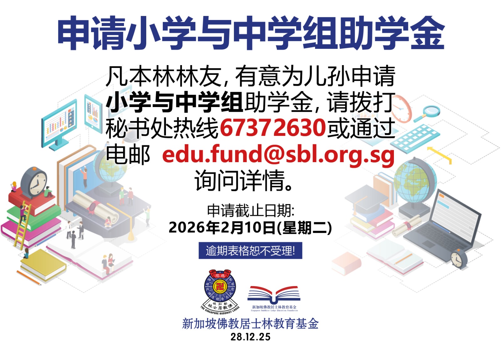 The Singapore Buddhist Lodge Education Foundation (SBLEF) publishes an annual circular - typically in Q4 of the preceding year or Q1 of the application year - calling for bursary applications from SBL members on behalf of their primary and secondary school children or grandchildren.